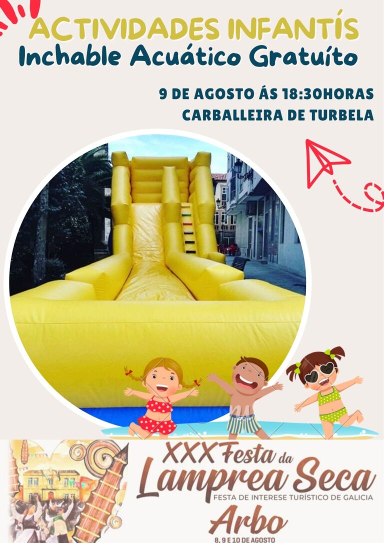 XXX FESTA DA LAMPREA SECA 9 DE AGOSTO (SÁBADO) 18:30h: ACTIVIDADES INFANTÍS. Inchable Acuático Gratuíto.