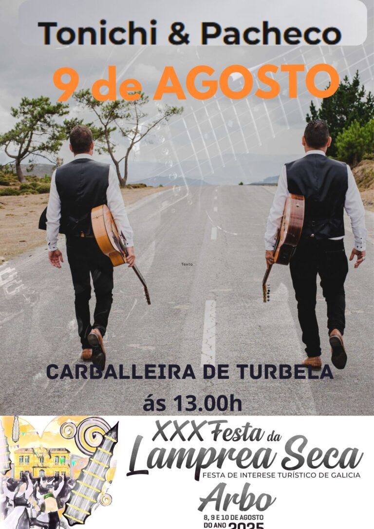 XXX FESTA DA LAMPREA SECA 9 DE AGOSTO (SÁBADO) 13.00h: Actuación do Grupo “TONICHI Y PACHECO”, na Carballeira de Turbela.