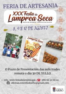 A “ Feira de Artesanía e Antigüidade da XXX FESTA DA LAMPREA SECA”, terá lugar na Carballeira de Turbela, coincidindo coa Festa da Lamprea Seca